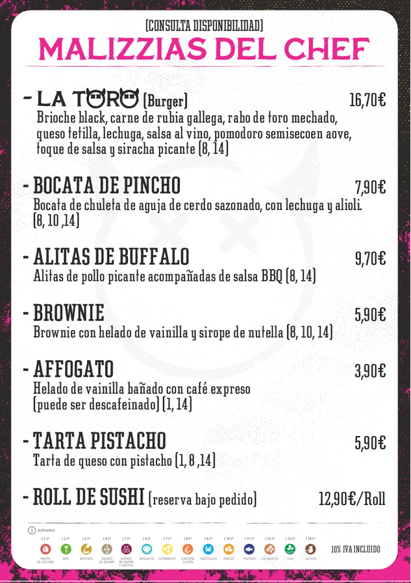 Brioche de patata, carne de vaca rubia gallega, queso de cabra puro, cebolla caramelizada (mermelada) y mayo ahumada. Acompañan patatas fritas. Contiene gluten, lácteos