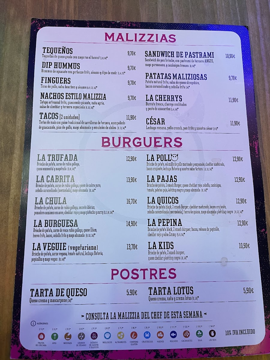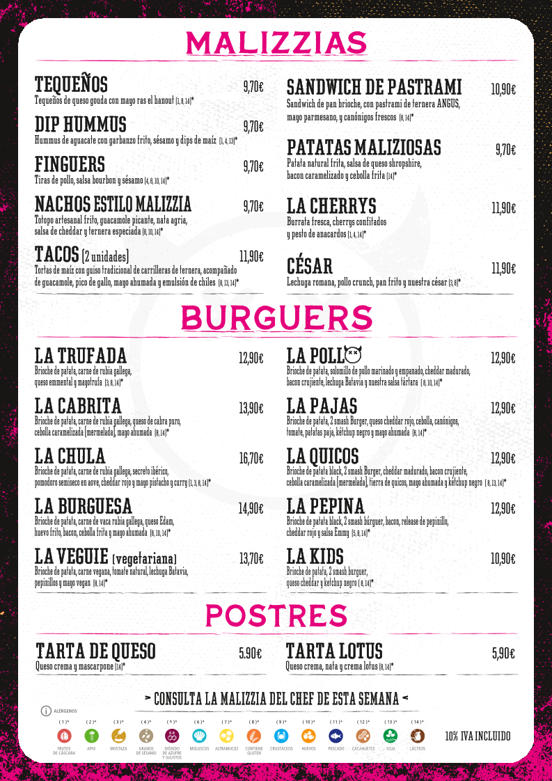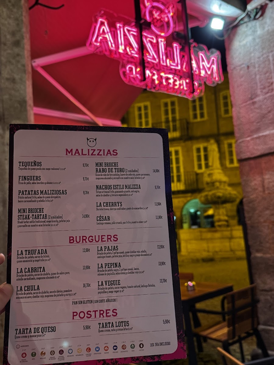 The menu at Malizzia Street Food in Lugo offers a delightful variety of dishes, perfect for any craving. For appetizers, you can start with the delicious Tequeños, Nachos Estilo Malizzia, or crispy Fingers De PolloSándwich. If you're in the mood for something spicier, the Alitas De Buffalo are a great choice. For a more filling option, the restaurant offers a variety of burgers, including the indulgent La Trufada, the cheesy La Quicos, the flavorful La Cabrita, the fresh La Veggie, and the classic La Burguesa. To complement your meal, they have a selection of alcoholic beverages such as Estrella Galicia Lata 33cl. For dessert, treat yourself to a sweet finish with either the creamy Tarta De Queso or the rich Tarta De Lotus. The drinks menu features both alcoholic and non-alcoholic options, with sodas like Coca-Cola Zero Azúcar, Fanta Naranja, and Aquarius Limón, as well as refreshing teas like FUCE TEA Limón. Whether you're in the mood for a snack or a hearty meal, Malizzia Street Food has something for everyone at affordable prices.