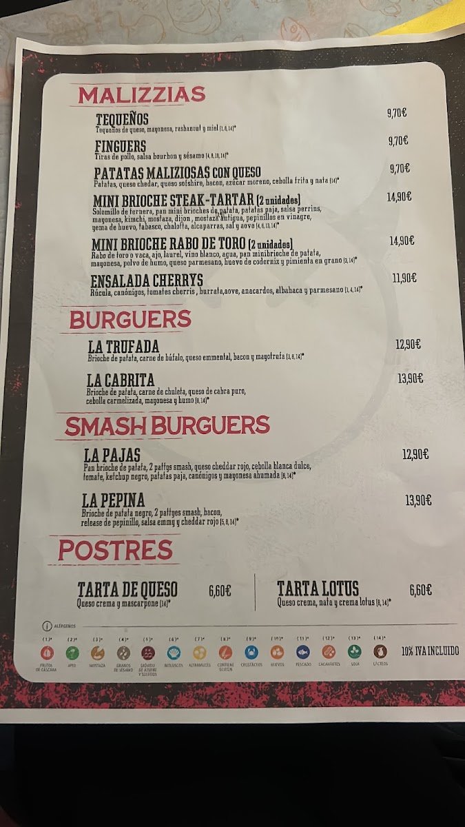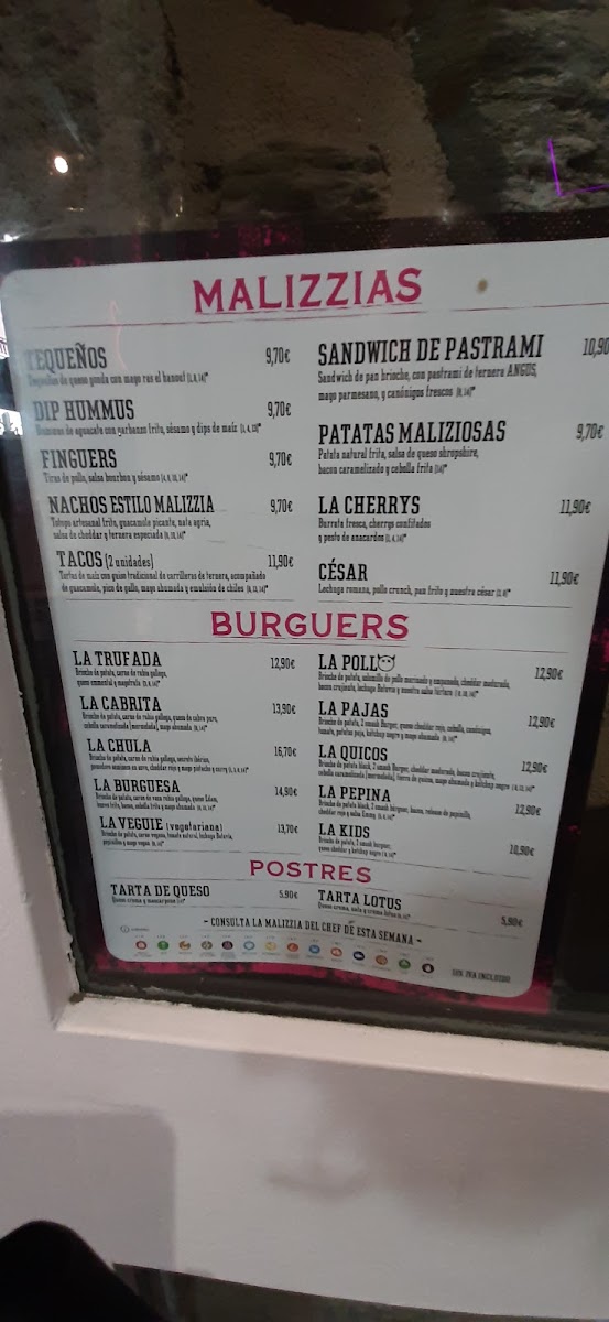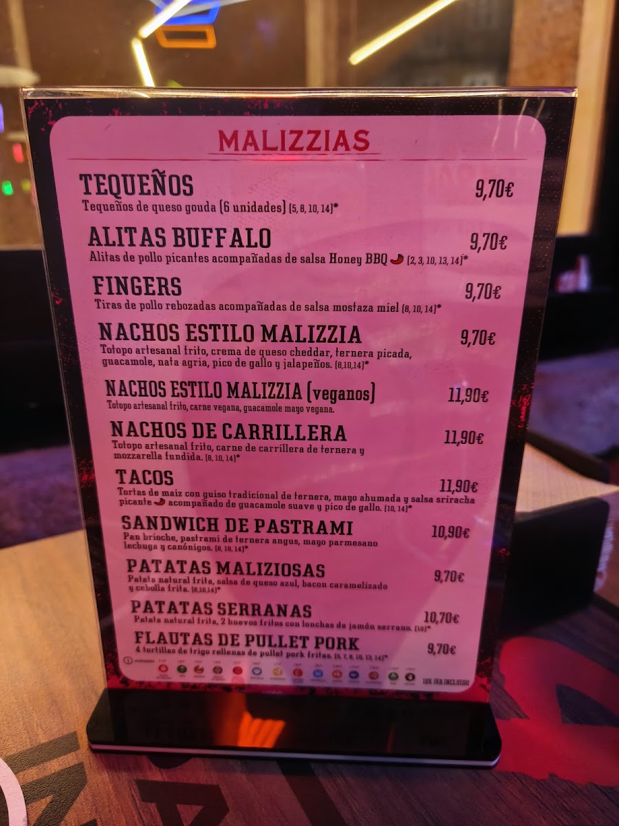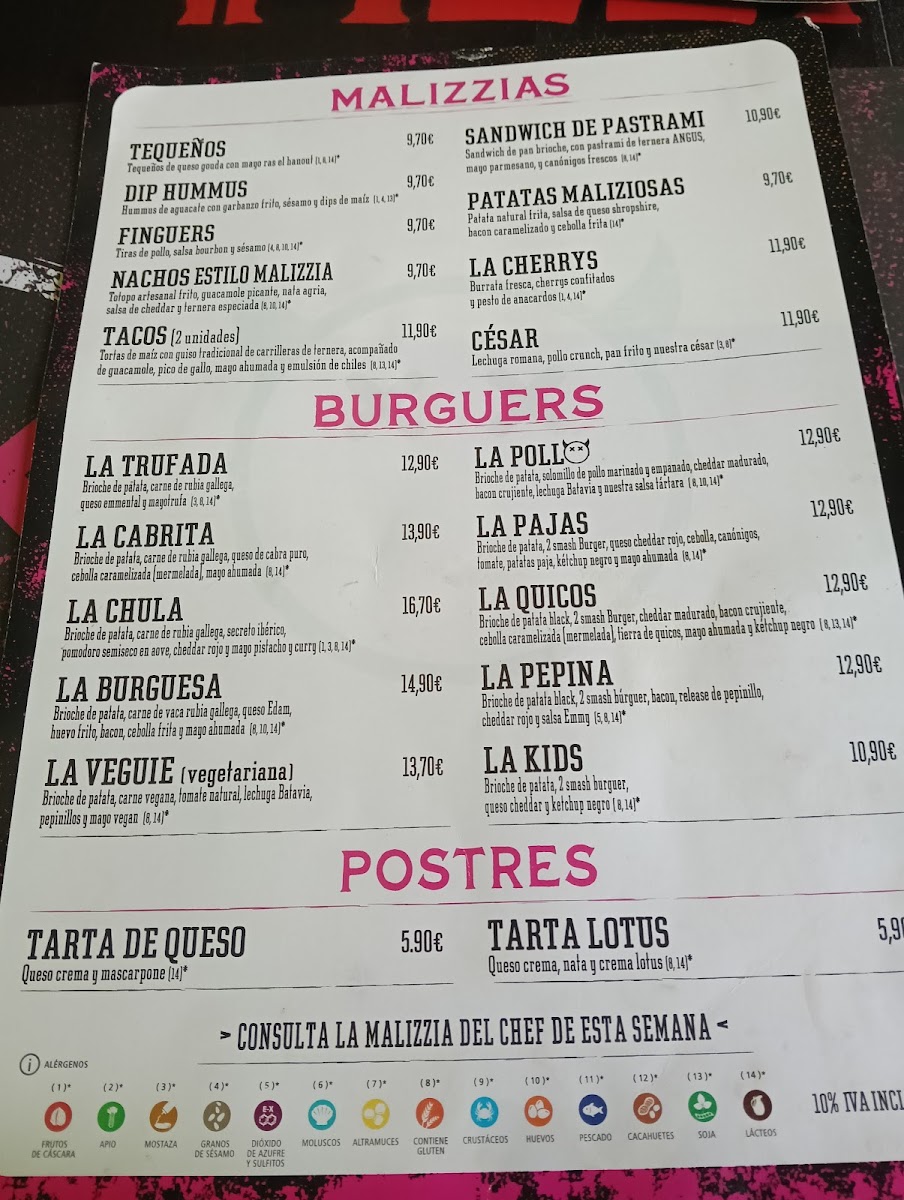 The menu at Malizzia Street Food in Lugo offers a delightful variety of dishes, perfect for any craving. For appetizers, you can start with the delicious Tequeños, Nachos Estilo Malizzia, or crispy Fingers De PolloSándwich. If you're in the mood for something spicier, the Alitas De Buffalo are a great choice. For a more filling option, the restaurant offers a variety of burgers, including the indulgent La Trufada, the cheesy La Quicos, the flavorful La Cabrita, the fresh La Veggie, and the classic La Burguesa. To complement your meal, they have a selection of alcoholic beverages such as Estrella Galicia Lata 33cl. For dessert, treat yourself to a sweet finish with either the creamy Tarta De Queso or the rich Tarta De Lotus. The drinks menu features both alcoholic and non-alcoholic options, with sodas like Coca-Cola Zero Azúcar, Fanta Naranja, and Aquarius Limón, as well as refreshing teas like FUCE TEA Limón. Whether you're in the mood for a snack or a hearty meal, Malizzia Street Food has something for everyone at affordable prices.